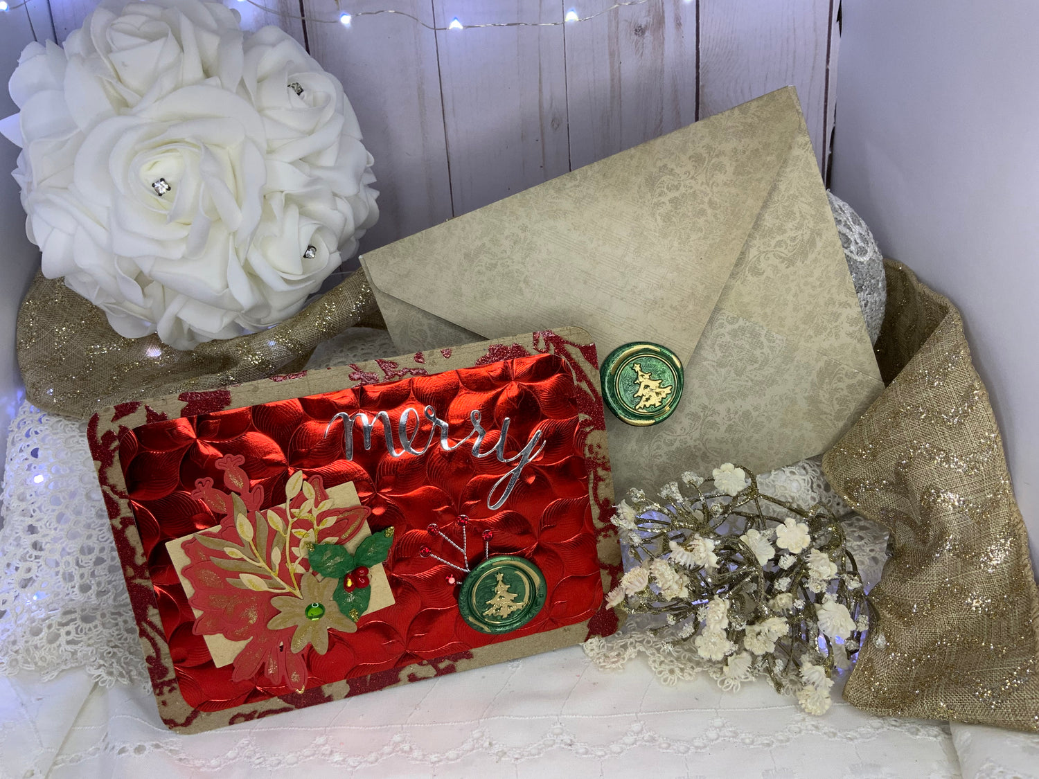 Beautifully embellished. Includes a handmade coordinating envelope with wax seal.